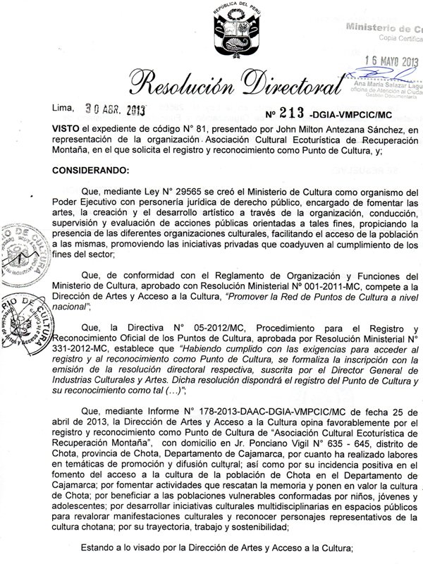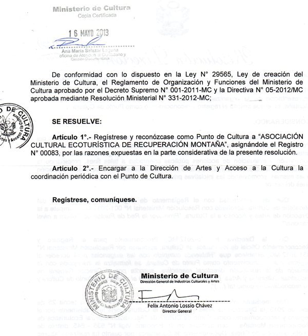 Entendiendo que un Punto de Cultura es toda organización, asociación, cooperativa, colectivo o agrupación cultural sin fines de lucro de la sociedad civil que se encuentre registrada y reconocida por el Ministerio de Cultura como tal, que desarrolle y/o promueva iniciativas en los más diversos campos, tomando el arte y la cultura como herramienta principal para contribuir a la construcción de una sociedad más justa, pacÃfica, solidaria, inclusiva y democrática que reconozca y valore su diversidad, memoria y potencial creativo, comunicamos con mucha alegrÃa y mayor compromiso la Resolución Directoral 213-DGIA-VMPCIC/MC del Ministerio de Cultura, resolviendo y reconociendo a A.C.E.R. “MONTAÑAâ€? como PUNTO DE CULTURA, con el Registro N° 00083 del 30 de Abril de 2013, firmada en Lima por Félix Antonio Lossio Chávez, Director General de Industrias Culturales y Artes del Ministerio de Cultura.