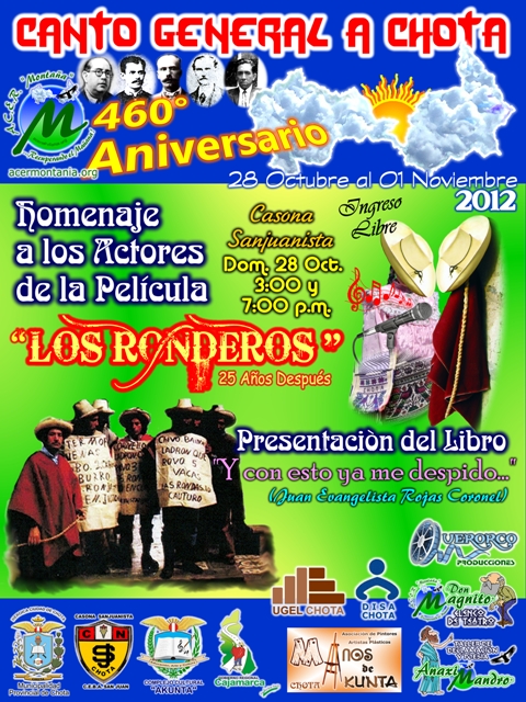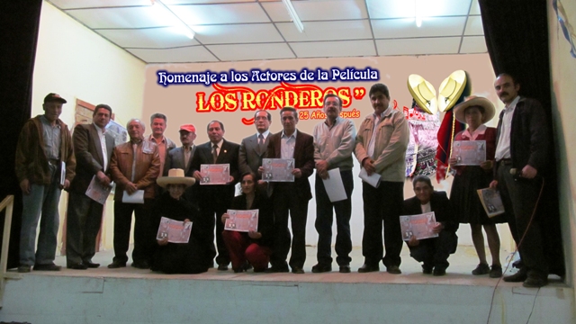 En el teatrín de nuestra Casona Sanjuanista, la noche del día del Concurso de Dibujo y Pintura – Manos de Akunta, domingo 28 de octubre de 2012, y continuando con nuestro “Canto General a Chota”, al conmemorarse el 460° Aniversario de Fundación Histórica de nuestra ciudad, realizamos el Homenaje a los Actores de la Película “Los Ronderos”: Reencuentro – 25 Años Después. Esta producción, estrenada en 1987, marca un hito en la cinematografía no sólo chotana sino nacional, porque puede ser la primera película realizada fuera de Lima (¡Habrá que ver!).