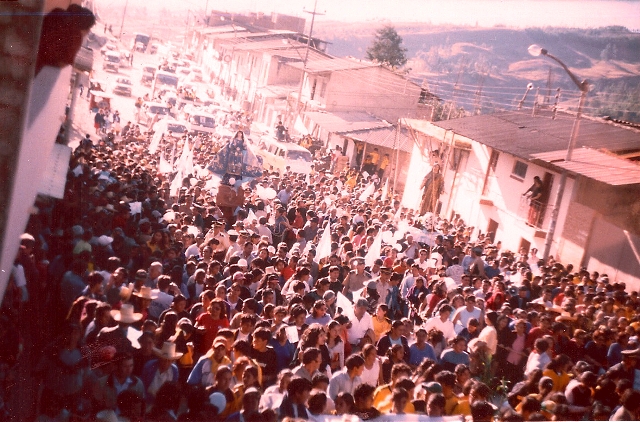 En fin, esa procesión de las dos imágenes visitantes, desde la carretera frente al colegio San Juan hasta el atrio de la catedral donde las esperaba impaciente nuestra Inmaculada, fue algo que nunca olvidaremos: jamás vimos en nuestra Alameda tanta gente reunida –claro está aparte de ese 5 de Agosto de 1953–. Fuimos testigos del lento pero sereno avance de las Madres de Cutervo y Lajas: de tan expresiva mirada la una y de una incomparable ternura la otra. Llegadas a la plaza, que ya estaba increíblemente repleta, que no entiendo cómo pudieron alcanzar los visitantes, prosiguió la vuelta olímpica que fue cada vez más triunfal; hasta que al fin y luego de saludarse las imágenes fueron ubicadas al lado de nuestra excelsa y radiante Inmaculada. Está demás decir que llegar a tocarlas entonces fue todo otra odisea.