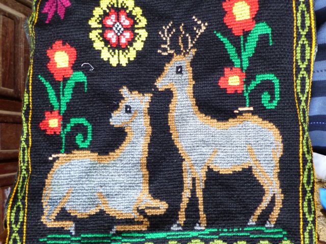 nos detenemos de nuevo en La Laguna, esperando serene la lluvia, aprovechando registrar a la señora Guevara, quien nos muestra sus grandes dotes bordando con increíble rapidez el cuadro de una bailarina. El retazo de corriente saqueta azul en poco tiempo va convirtiéndose en obra de arte; algo ya común en Chiguirip, condimento de la amplia sala de la casa adornada por hermosos y singulares paisajes. La carona con motivos o labor de venados (imagen completa al inicio de este artículo) nos deja realmente impresionados.