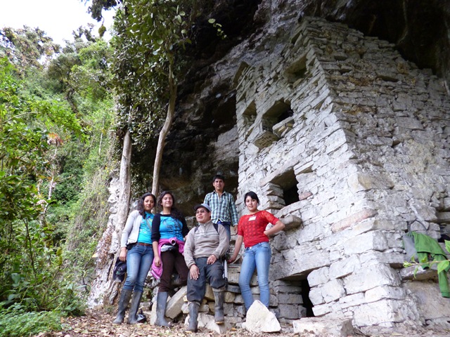 Es impresionante la primera vista de la chullpa edificada en lo alto de un morro escondido en la montaña. La chullpa, hecha de lajas existentes en todo el lugar, tiene el aspecto de un gigantesco rostro que nos recibe en cuanto logramos la desafiante escalada, contando además con unas vigas interiores milenarias que nos hacen admirar el genio y visión de sus constructores. A manera de anécdota, no dejamos de contar las palabras de Ángel Salvador, encargado de apoyar a Ruth en todo momento, diciendo a media subida y como para matizar el peligro: “Esto ya no es turismo de aventura… esto es gafera” (risas).