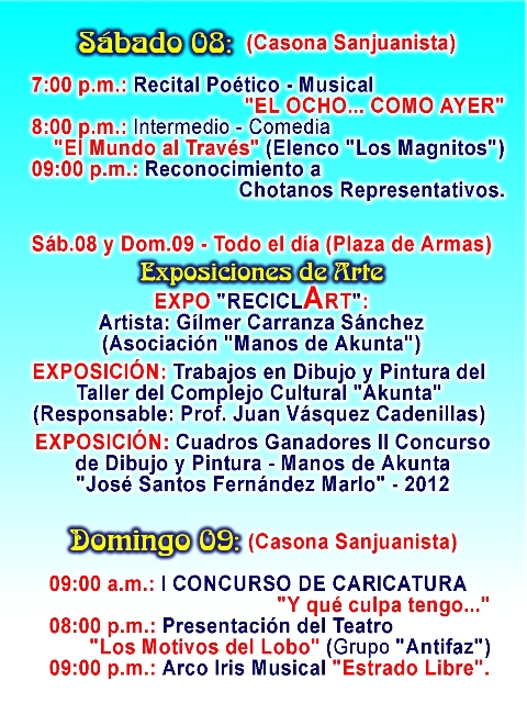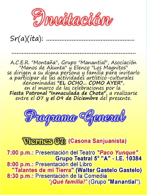 Tal es el compromiso de A.C.E.R. «Montaña», a través de su Elenco de Teatro «Don Magnito» y el Grupo de Creación Literaria «Pluma Libre«, sumada ahora al talento del Grupo de Teatro «Manantial» y de la Asociación de Pintores y Artistas Plásticos de Chota «Manos de Akunta», para realizar las siguientes actividades, entre el 7 al 9 de diciembre próximo, en el marco de las celebraciones por la Fiesta Patronal en honor a la Virgen Inmaculada Patrona de Chota: