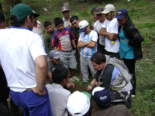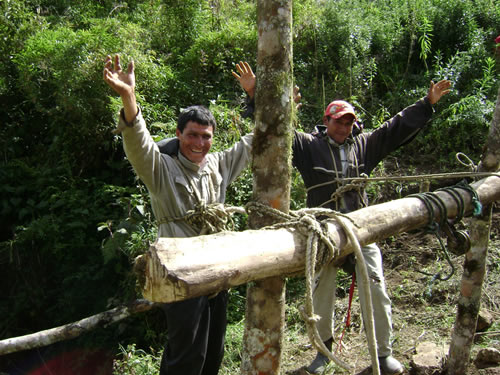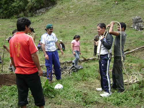 En ese momento recordamos lo que anteriormente nos había contado la campesina y nos dijimos  ¿Yo, voluntario? ¡Ni loco que fuera! Sí, esa era la mejor consigna. De  pronto de un salto se puso en pie Temi Gavidia, aún no sabemos si fue por valentía o porque le picó una hormiga, preguntando ¿Quién dijo yo?, ¡pero si nadie lo dijo! entonces empezó a enroscar la soga en su cuerpo a manera de arnés. Al ver esta loable actitud Leonardo lo ayudó pues es experto haciendo nudos marineros.