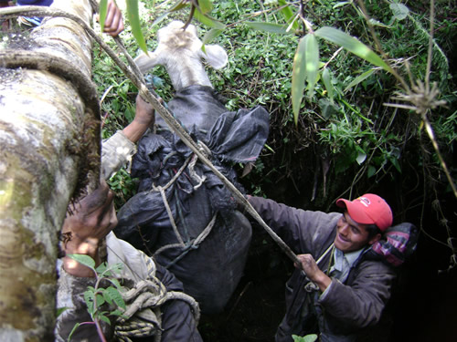 Nos pusimos de acuerdo tácitamente y conjuntamente iniciamos el rescate. Los comuneros cortaron dos árboles, uno fue colocado de canto a canto entre las fauces del foso y se lo aseguró con estacas; el otro fue cortado en tres para afirmar en el suelo el armazón de la polea que nunca cumplió su función y luego se alistaron las sogas. Todo estaba listo, pero ahora el dilema, ¿quién baja? Se hizo el silencio, nos miramos sin decir nada y empezaron en nuestras cabezas sesudas deliberaciones morales.