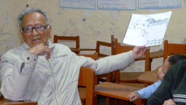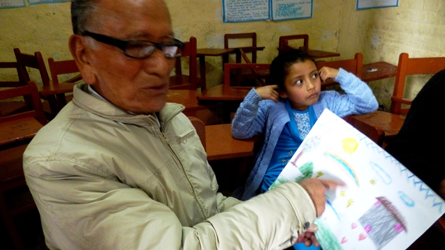 Sin habérnoslo propuesto, contando con al apoyo como siempre presto de don José Santos Fernández Marlo, conocido como Don Marlito, de pronto volvimos a enlazar generaciones de artistas tan distantes y a la vez tan unidos por el alma del arte. Nos referimos al maestro en mención, de 90 años, impartiendo sus conocimientos por ejemplo a la pequeña Fiorela Jhasmin, de apenas 6 años.