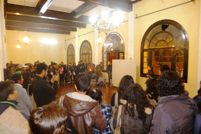 7:30 pm: Presentación del Encuentro por parte de Paloma Carpio, responsable del Programa Puntos de Cultura del Ministerio de Cultura; palabras de bienvenida a cargo de David Ugarte, Director de la Dirección Desconcentrada de Cultura de Cusco; presentación de cada uno de los representantes de los 102 Puntos de Cultura presentes en el Encuentro; y presentación de una banda y danzas cusqueñas que dieron inicio al pasacalle.