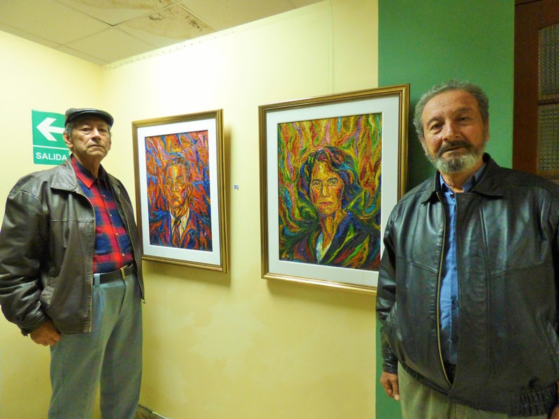 Labogál y César Saldaña Fernández observando el cuadro de la casa familiar del artista