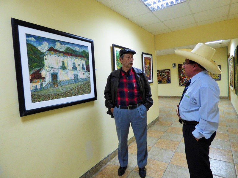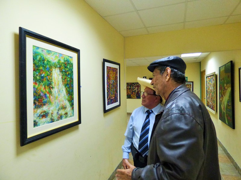 Labogál mostrando su cuadro "El Cóndac" a César Saldaña Fernández (A.C.E.R. "Montaña" – Lima), durante la Exposición de junio en Chota