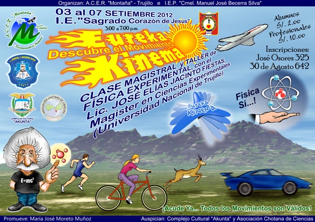 Alumnos y docentes de cuarto, quinto de secundaria, preuniversitarios y público en general, APROVECHEMOS esta gran oportunidad de relacionarnos con la Física del modo más experimental, gracias a la sabiduría que nos trae el Prof. José Elías Jacinto Fiestas (Licenciado en Educación con mención en Ciencias Físicas y Matemáticas, Magister en Didáctica de las Ciencias Experimentales y docente de la Universidad Nacional de Trujillo), quien visitará nuestra ciudad exclusivamente para este evento, promovido por María José Moreto Muñoz (miembro fundadora de A.C.E.R. «Montaña» y ex-alcalde escolar de la I.E. «Santa Rafaela María») y organizado por la Asociación «Montaña» en coordinación con la I.E.P. «Crnel. Manuel José Becerra Silva» y el auspicio del Complejo Cultural «Akunta» y la Asociación Chotana de Ciencias.
