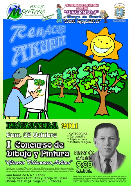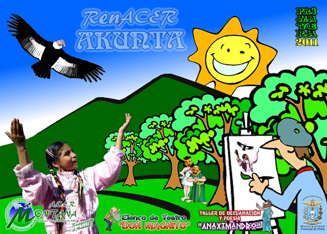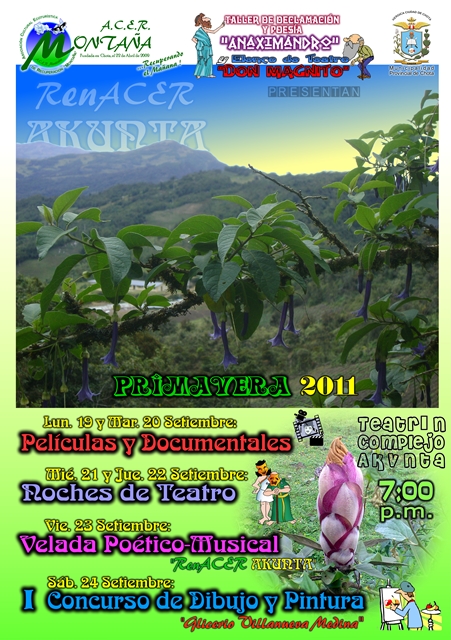 y cumpliendo nuestro plan de trabajo, esta vez en lo relacionado a nuestras facetas cultural y ecológica, preparamos con anticipación la celebración de la Semana de la Primavera 2011, que denominamos RenACER AKUNTA, en honor obviamente a la estación de renovación de la vida y de todas las cosas, incluyendo el arte, expresado en las disciplinas del cine, el canto, la poesía, el teatro y la pintura, representados a su vez y sobre todo por nuestros valores chotanos más noveles, sean montañas o todavía no.