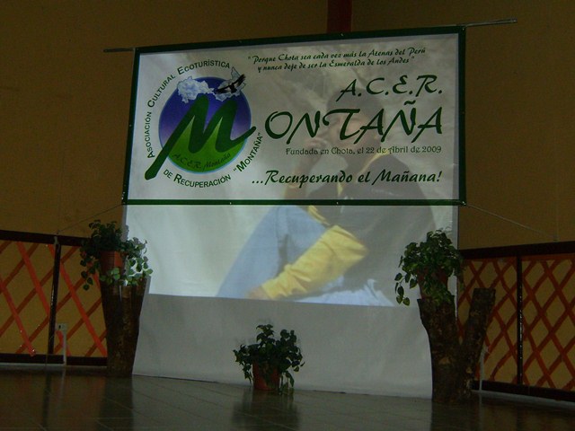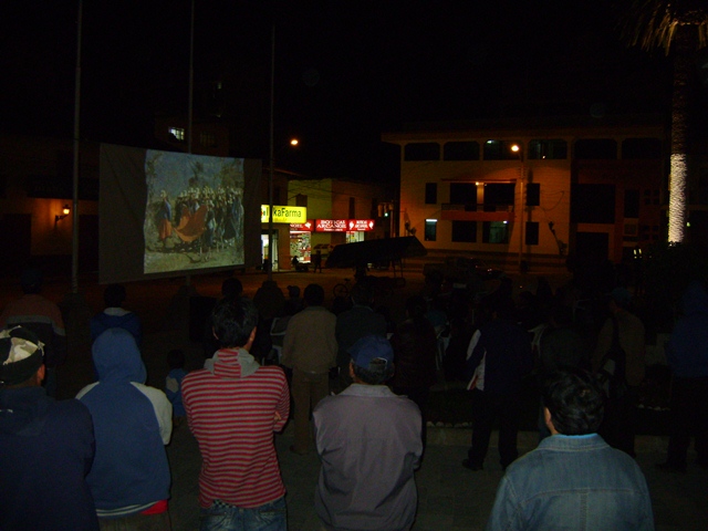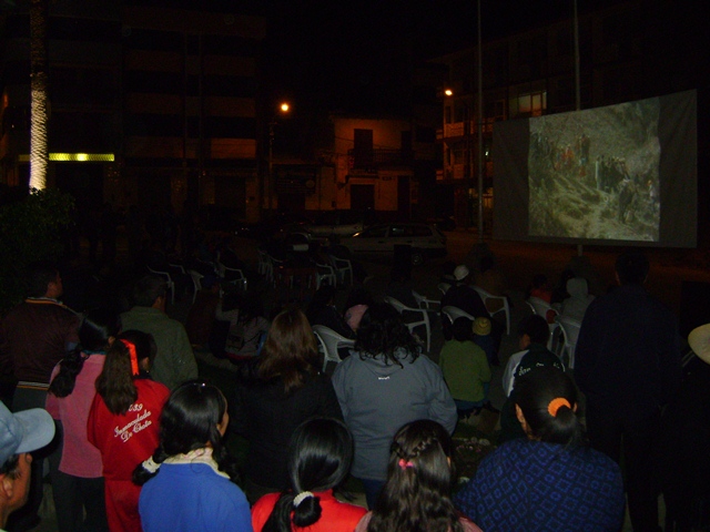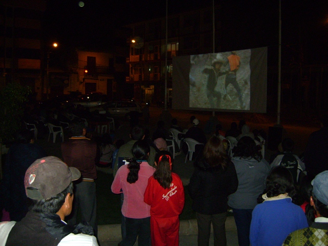 Para esto acudimos al apoyo de la Municipalidad Provincial de Chota, logrando el respaldo decisivo de la misma, a través, especialmente, de la Oficina de Imagen Institucional, con quienes elaboramos un écran gigante y junto con los equipos de proyección y sonido que nos facilitan, iniciamos el Ciclo de Películas y Documentales de corte cultural-ecológico que cada fin de semana continuamos ofreciendo en el espacio de nuestra plaza de armas, entre los mástiles y el kiosko de la misma.